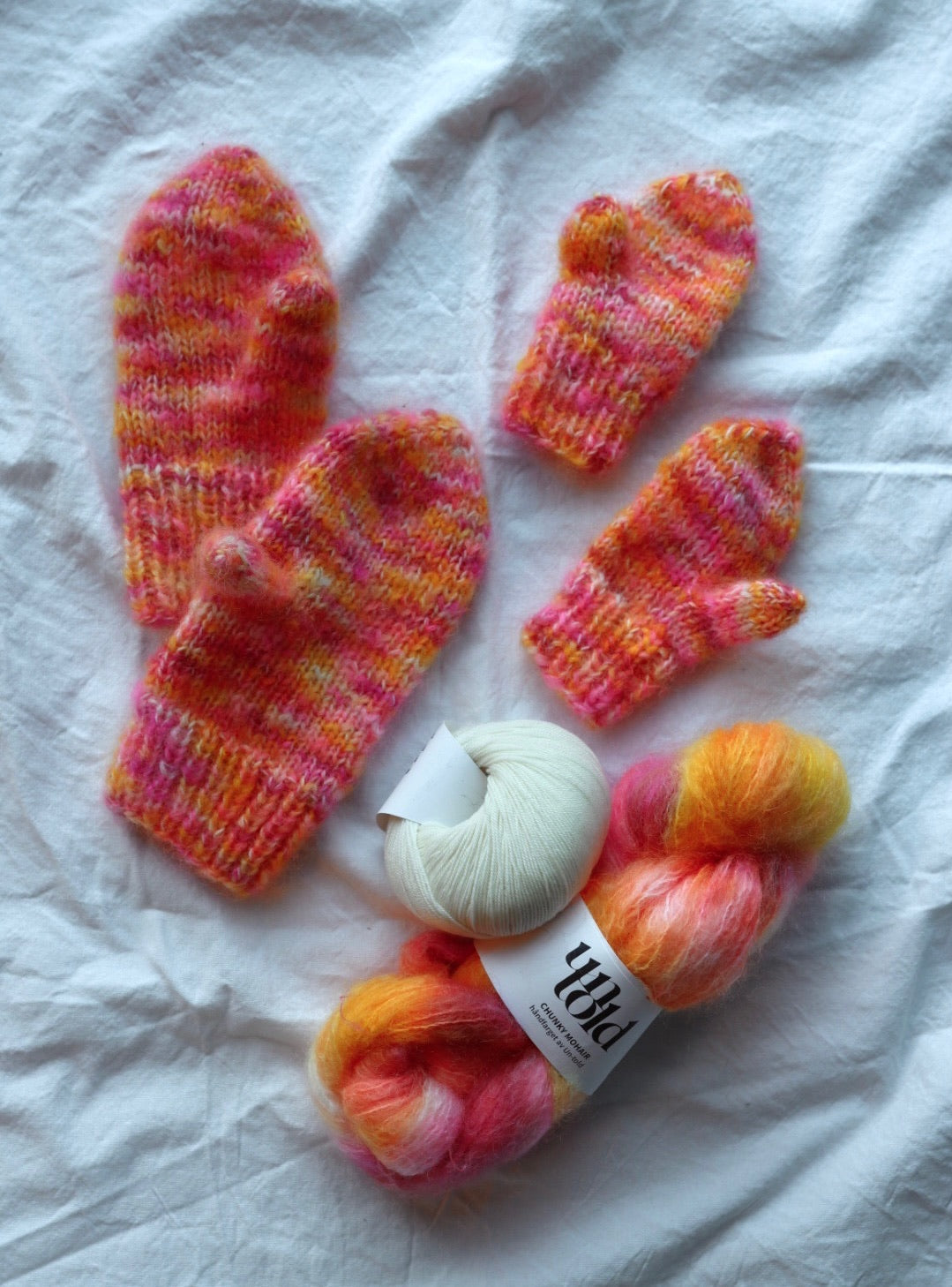 More mohair mittens er kjappstrikket, supermyk og du får to par på et hespe/nøste av hver sort!