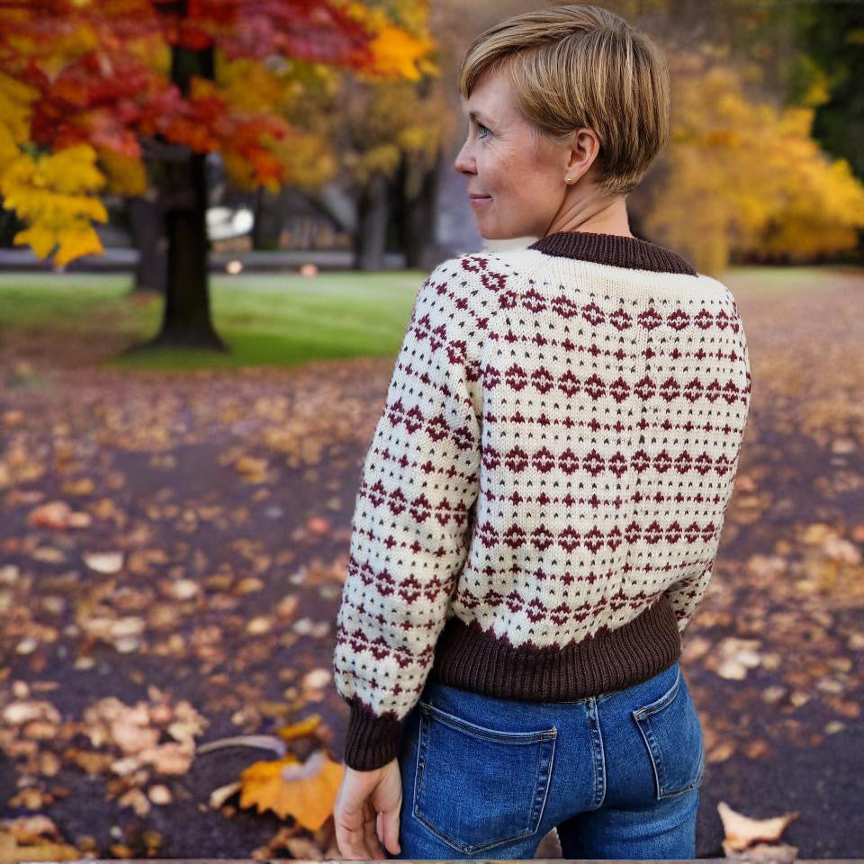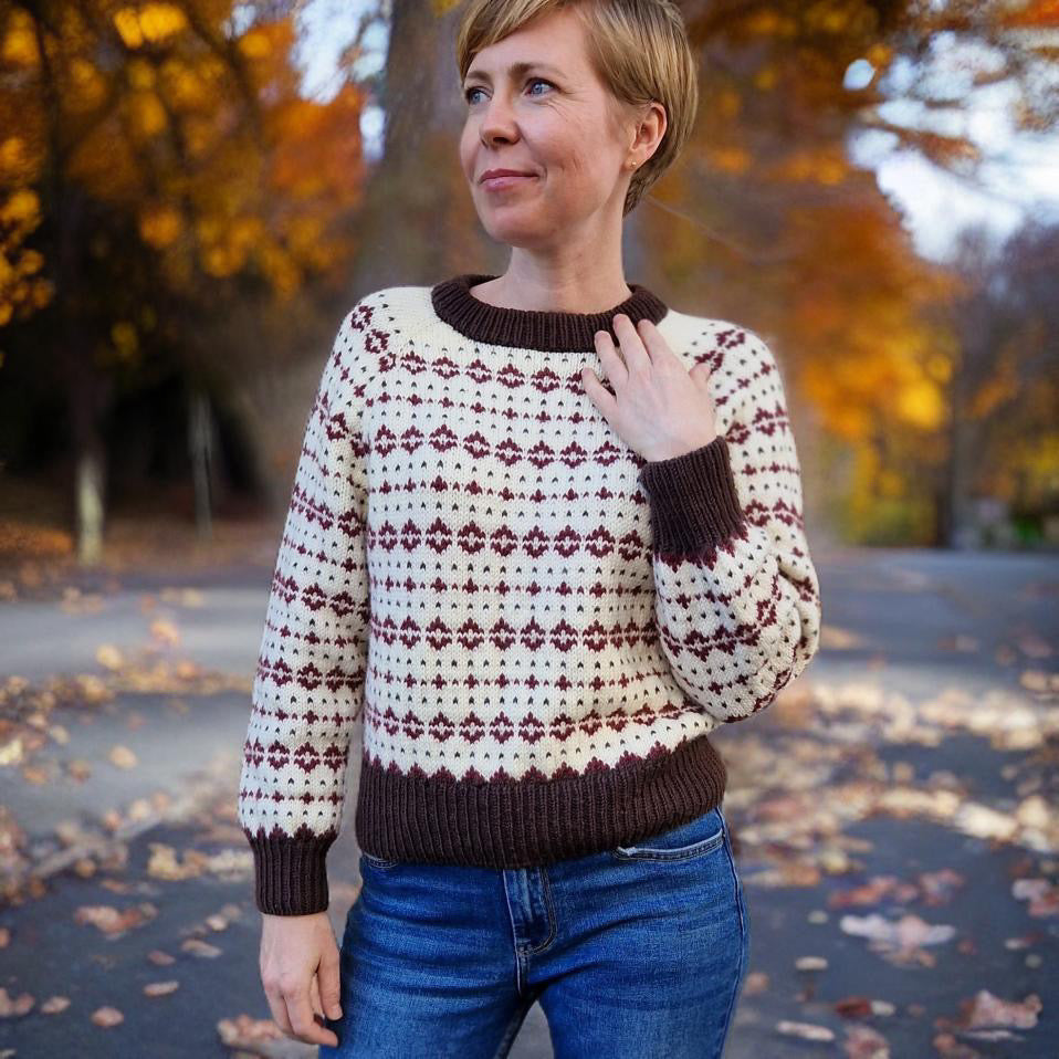 Norasweater strikkes ovenfra og ned, med raglanøkning og mønster hele veien. Mønsteret er lettlært og sitter fort i fingrene!