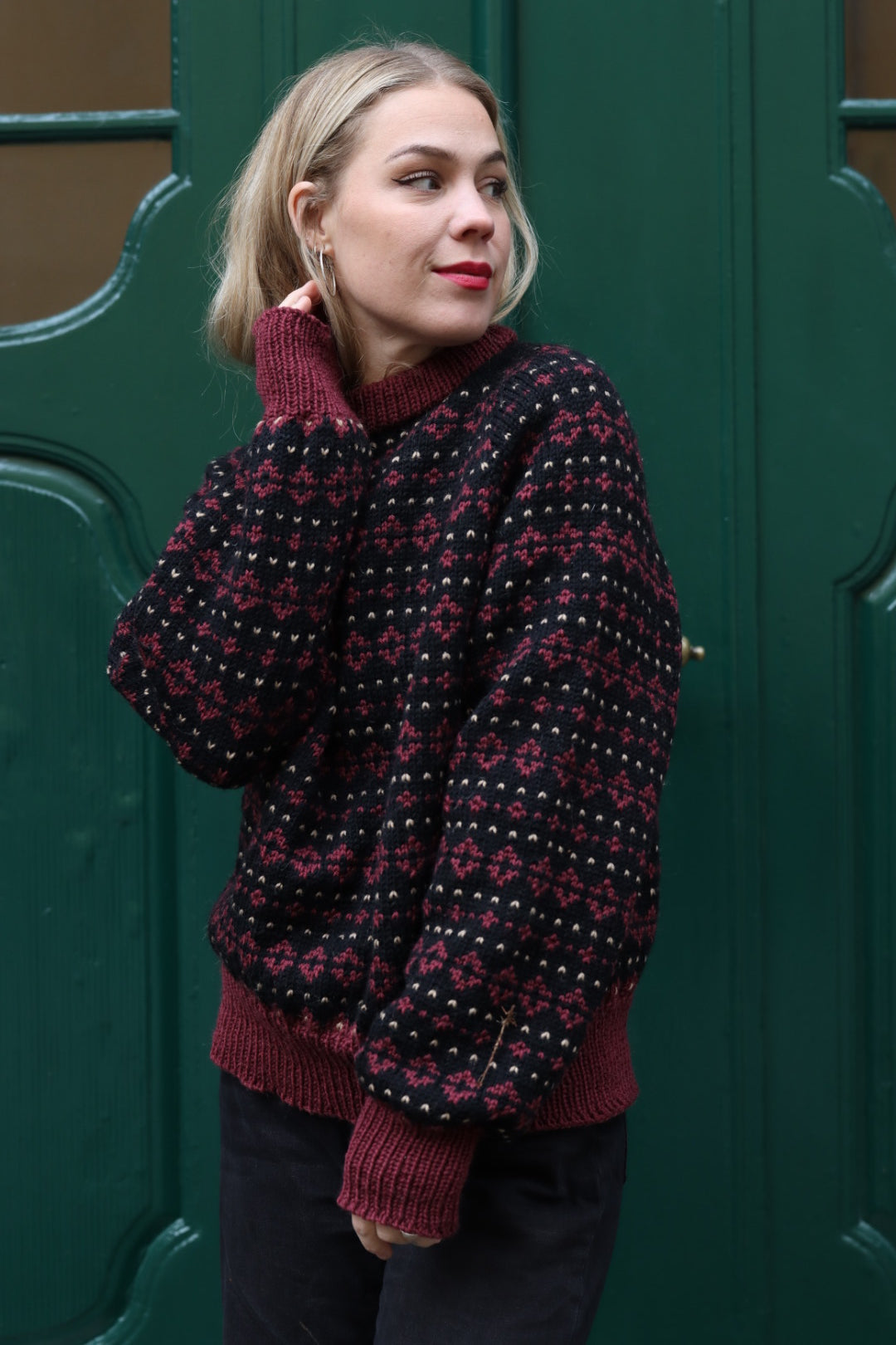 Genserene på bildene er strikket i fargene Jet Black, Rouge Noir og Ivory, og Ivory, Rouge Noir og Dark Chocolate.