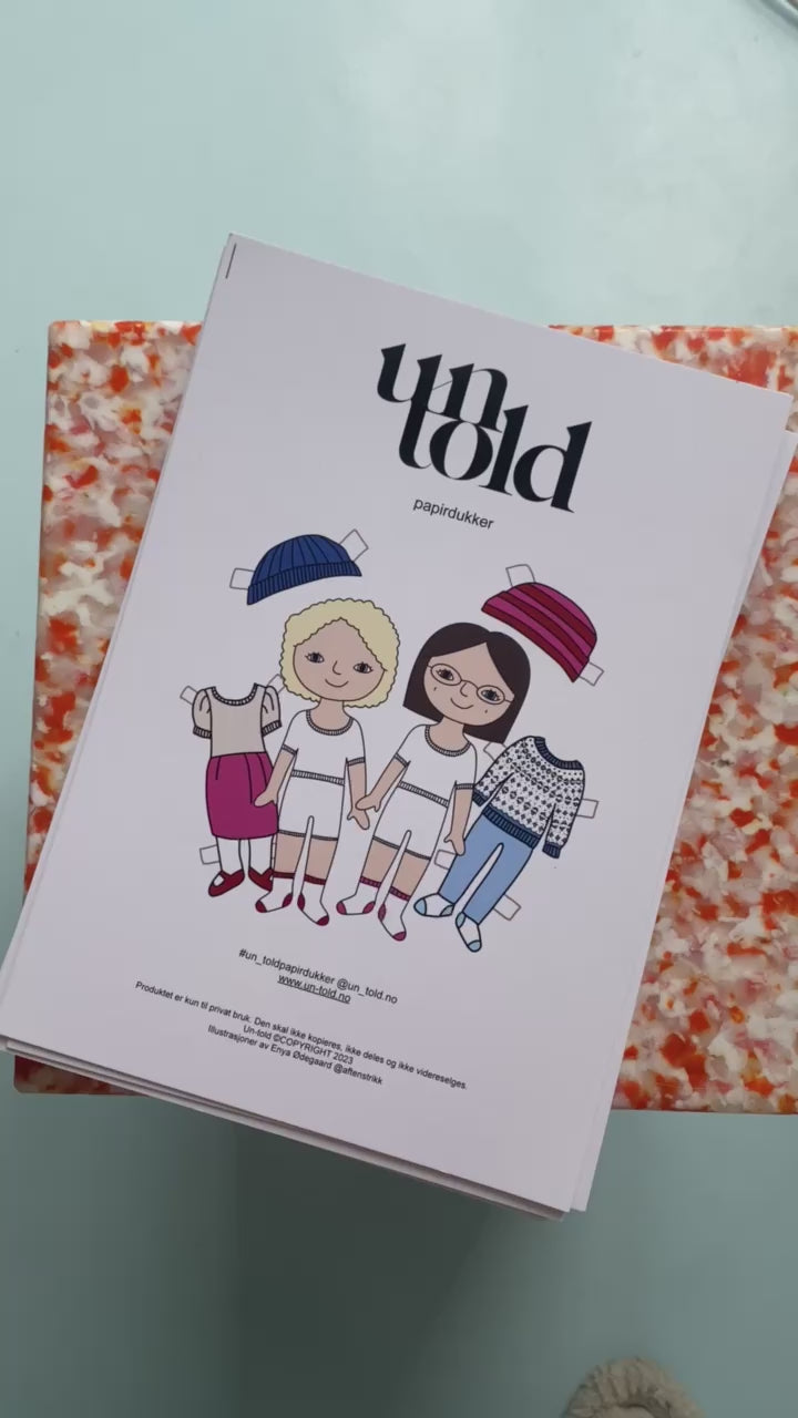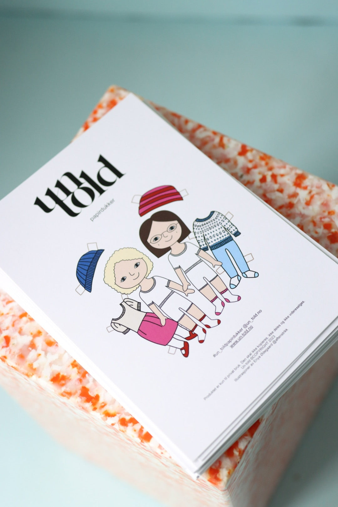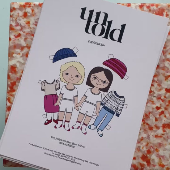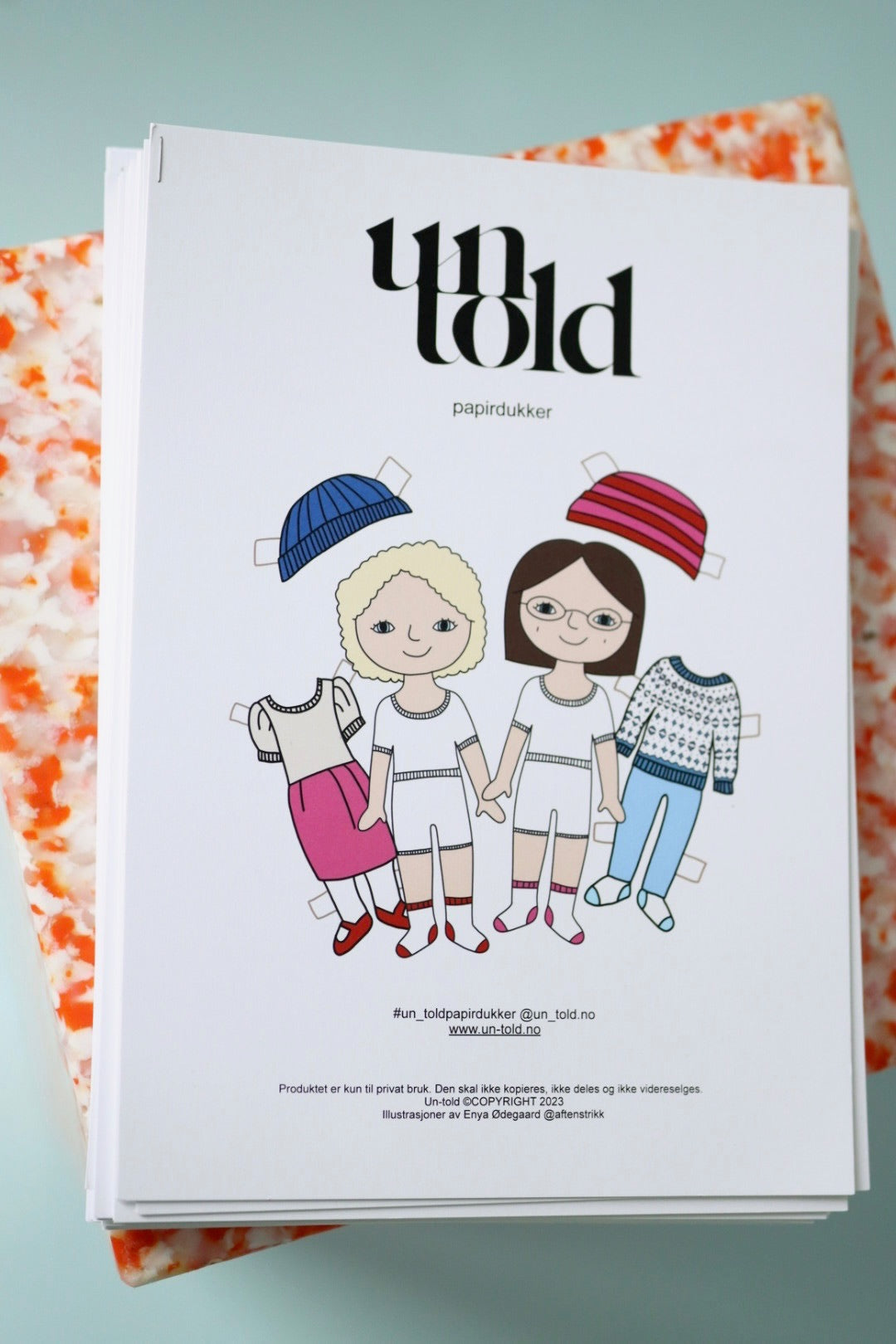 En sjarmerende pakke med papirdukker illustrert av Enya fra Aftenstrikk, inspirert av Un-told sine strikkeoppskrifter. Her kan du kle på dukkene med små versjoner av kjente Un-told-plagg – perfekt for lek, kreativ utfoldelse og en dose strikkeglede på papir.