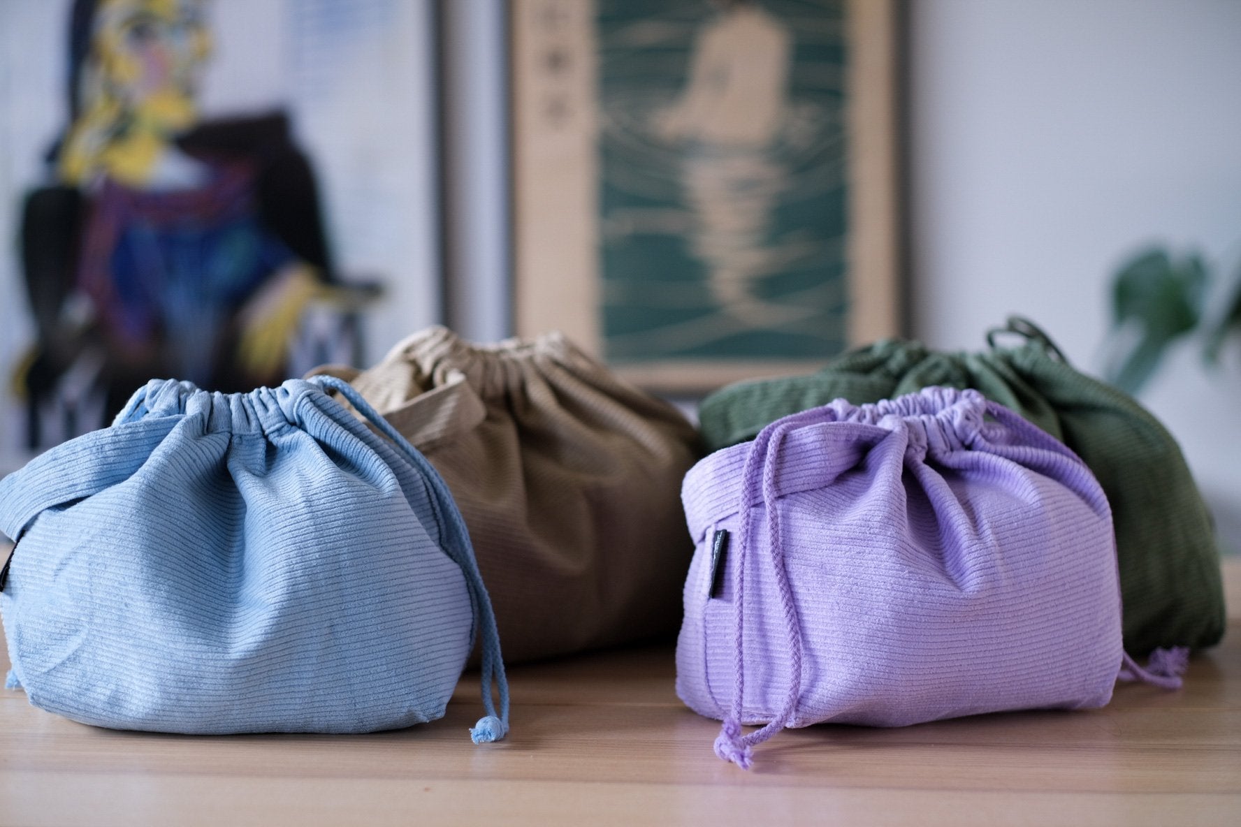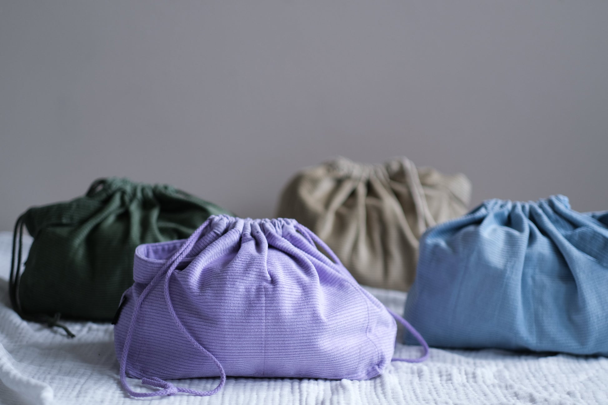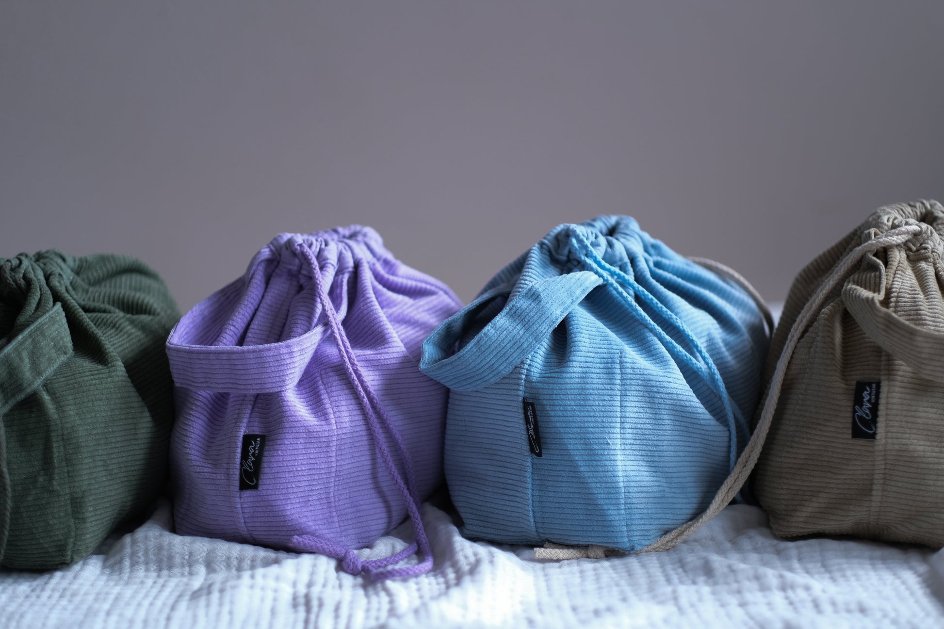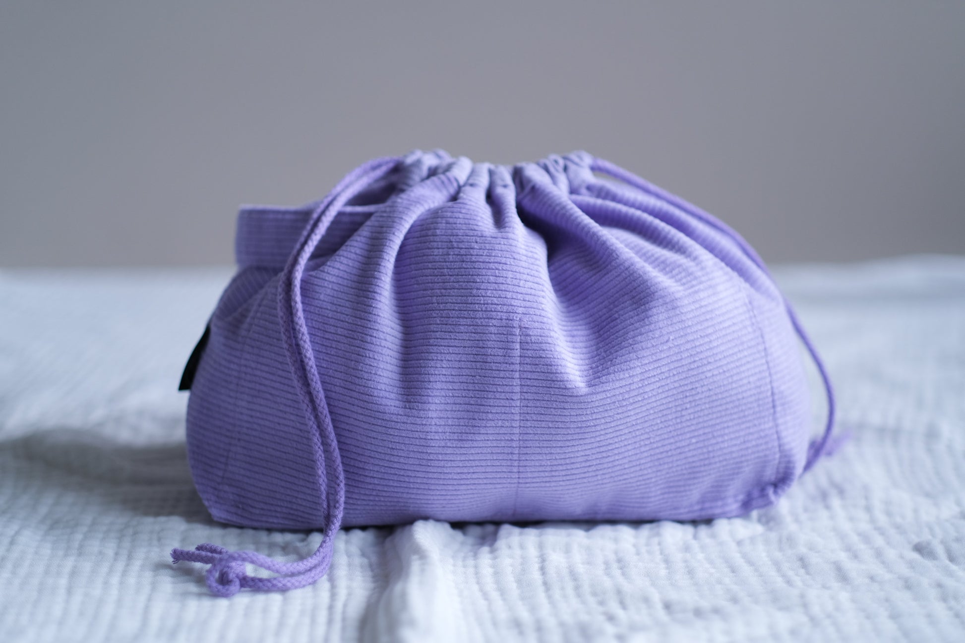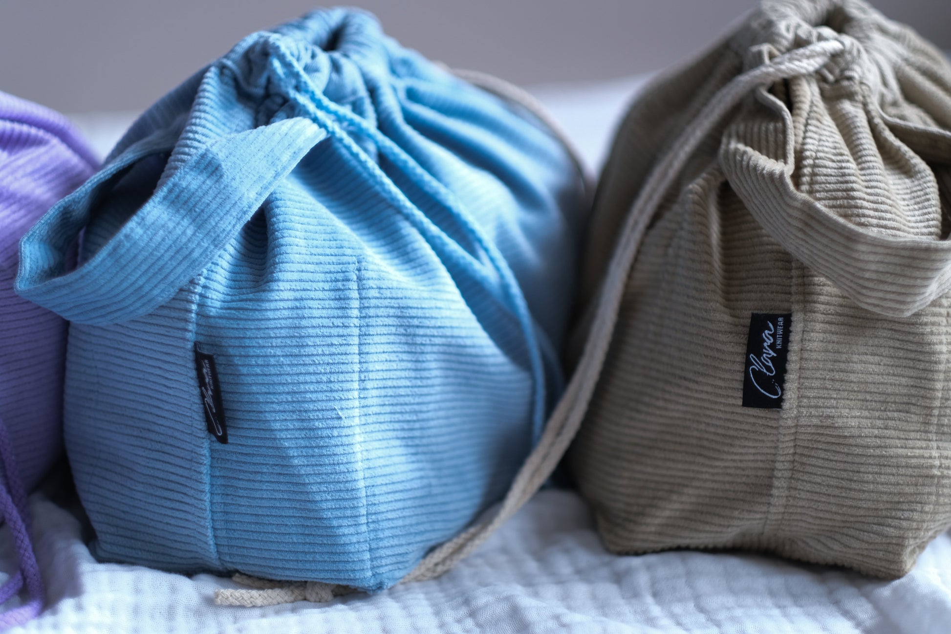En romslig og praktisk prosjektpose / prosjektveske for strikking laget i cord-fløyel. Prosjektbagen har innvendige lommer på begge sider og håndtak og lukkes med snøring. På den ene siden er det 3 små lommer til strikkepinner og en liten lomme til småting. Prosjektbagen har to store lommer på motsatt side.