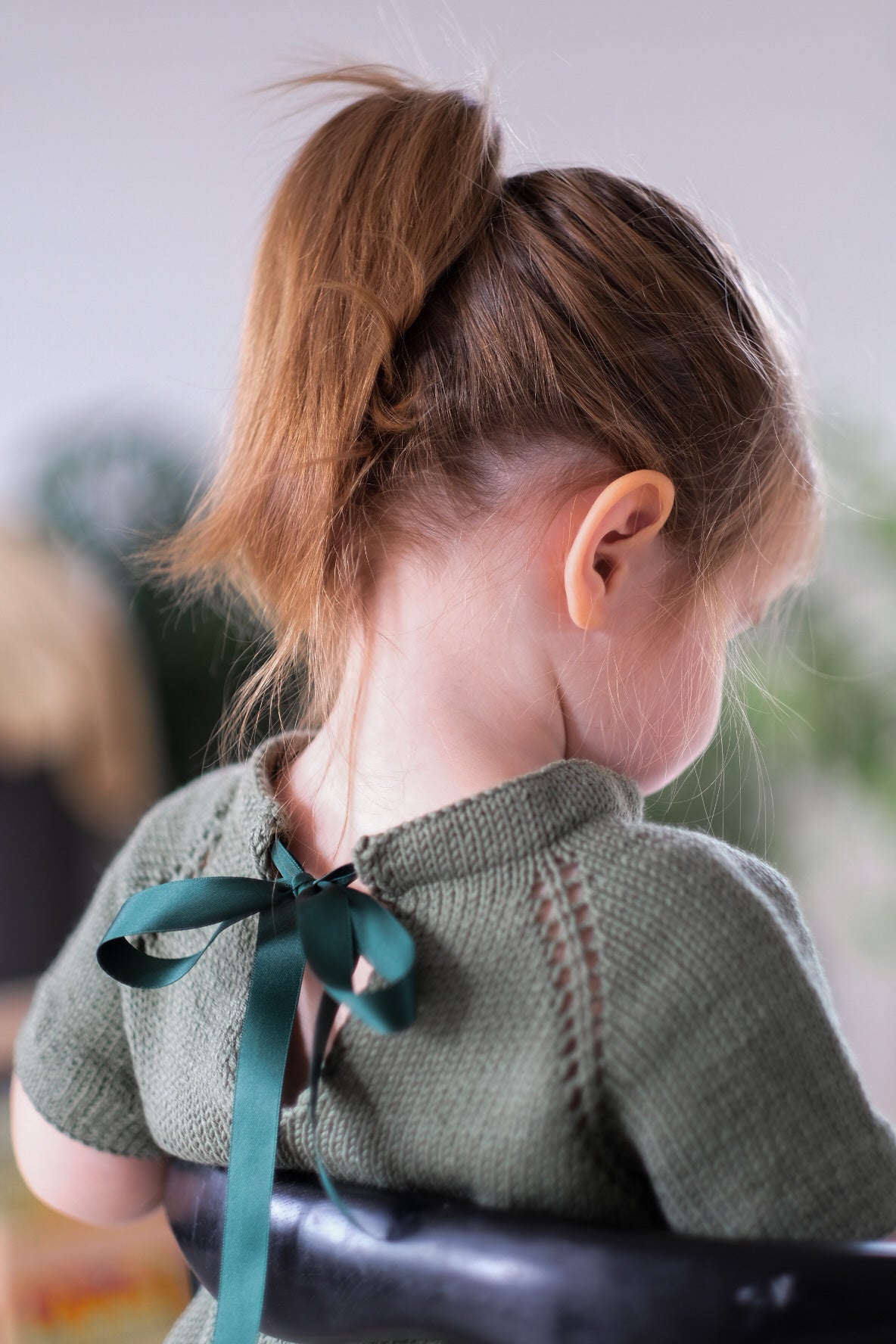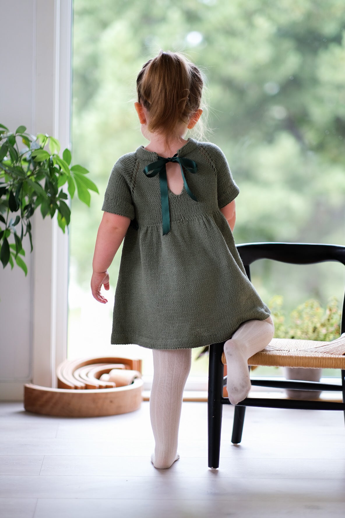 Sonjakjole er en enkel kjole som strikkes ovenfra og ned med løpegang i halsen og ermene.