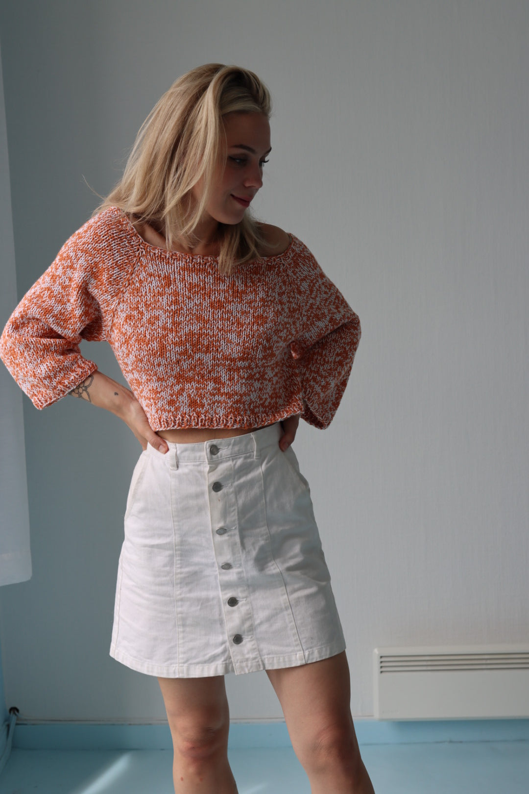 The sweaters in the photos are knitted in the colors Bright White and Bubblegum. And Bright White and Sunset Orange.