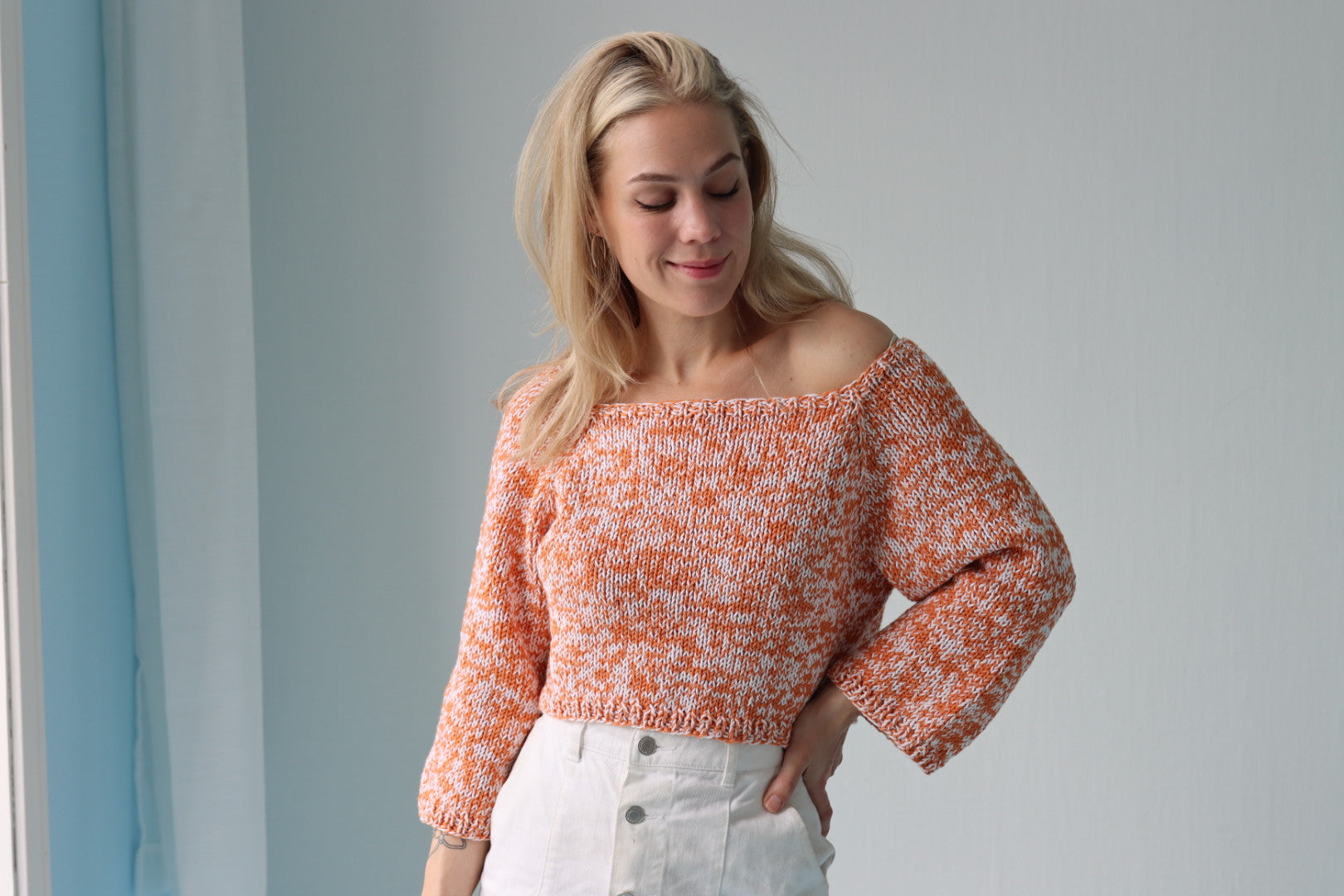 This sweater is worked top down with double thread Cotton Merino in two different colors for a blending effect. Work the sweater to your preferred length, or work it as explained here for a cropped version.