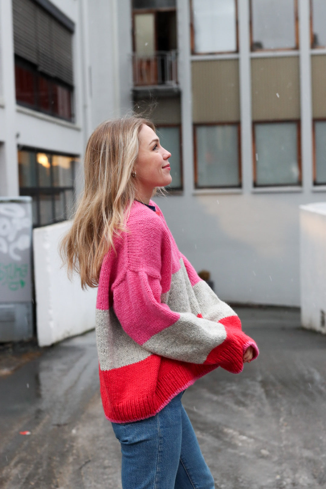 Genseren på bildet er strikket i fargene Pink Punch, Cloudy Grey og Cherry Red. Den ensfargede er strikket i fargen Chocolate. Den stripete nøytrale er strikket i fargene Ivory, Dune og Chocolate.