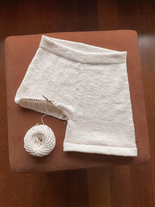 Shortsene på bildene er strikket i fargene Poolside Blue og Ivory. Takk til @m_strikk for lån av bilder. OBS: beskrivelse av strikket snor er ikke med i oppskriften.
