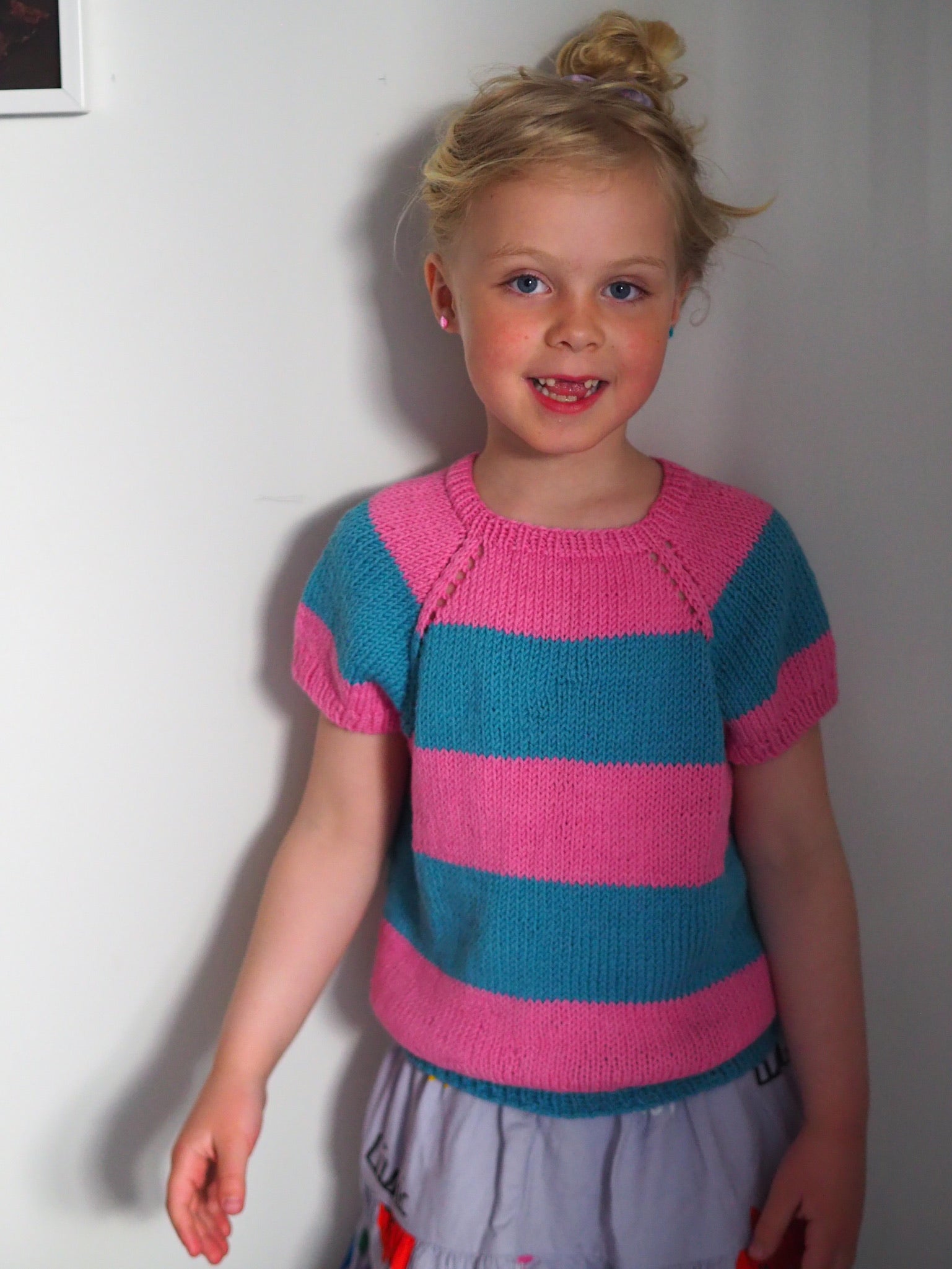 Un-told basic tee is a wonderful summer shirt that is worked top down with raglan increases, which are knitted with yarn overs and with wide sleeves. It is a quick knit and you can use the pattern as a basic pattern. It can easily be tried on by the child while knitting.
