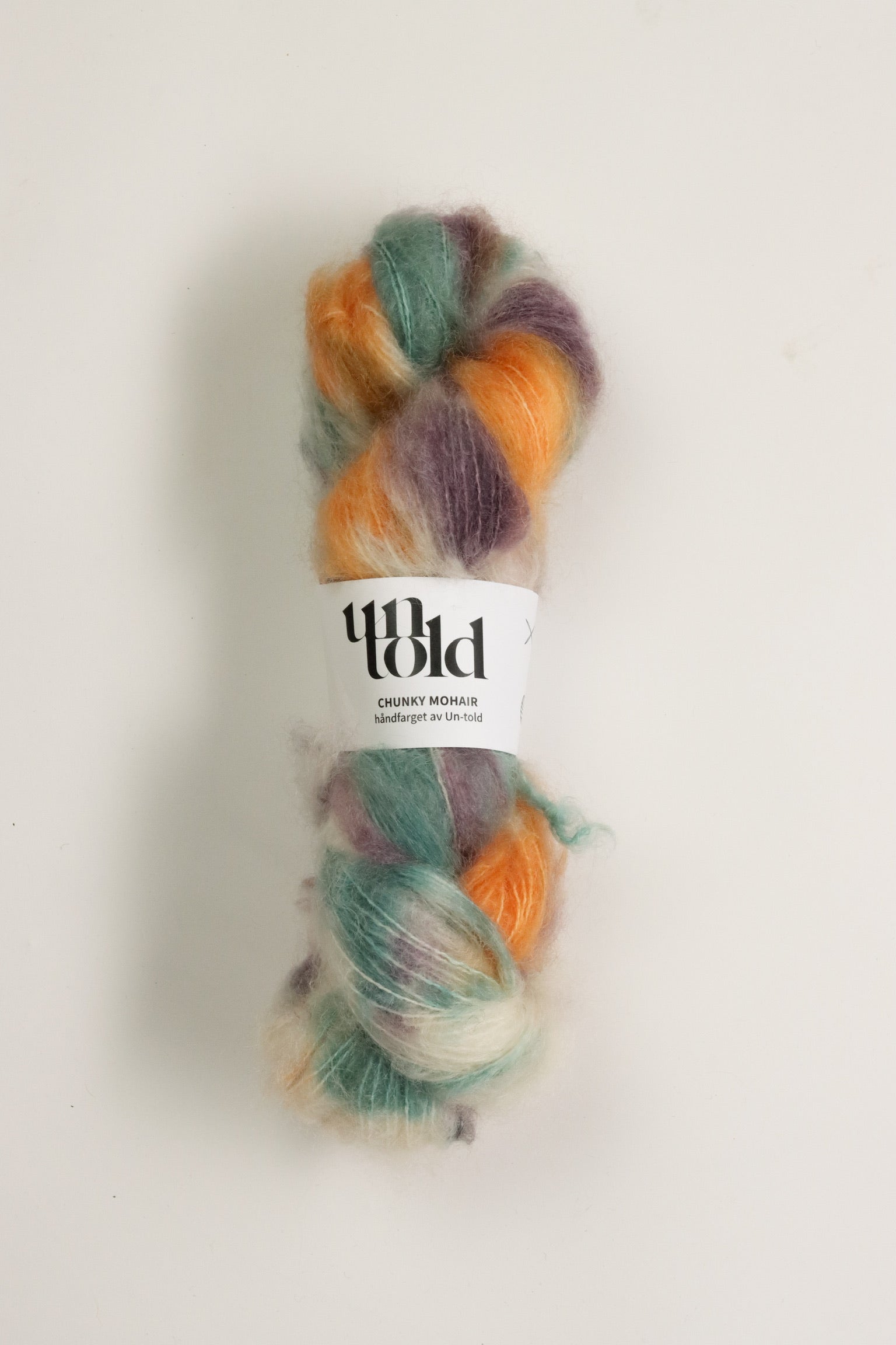 Un-told Chunky mohair er myk og fluffy Non-superwash fat mohair! Garnet er håndfarget av Un-told. Chunky mohair kommer opprinnelig fra Sør-Afrika på gårder hvor mulesing ikke foregår.