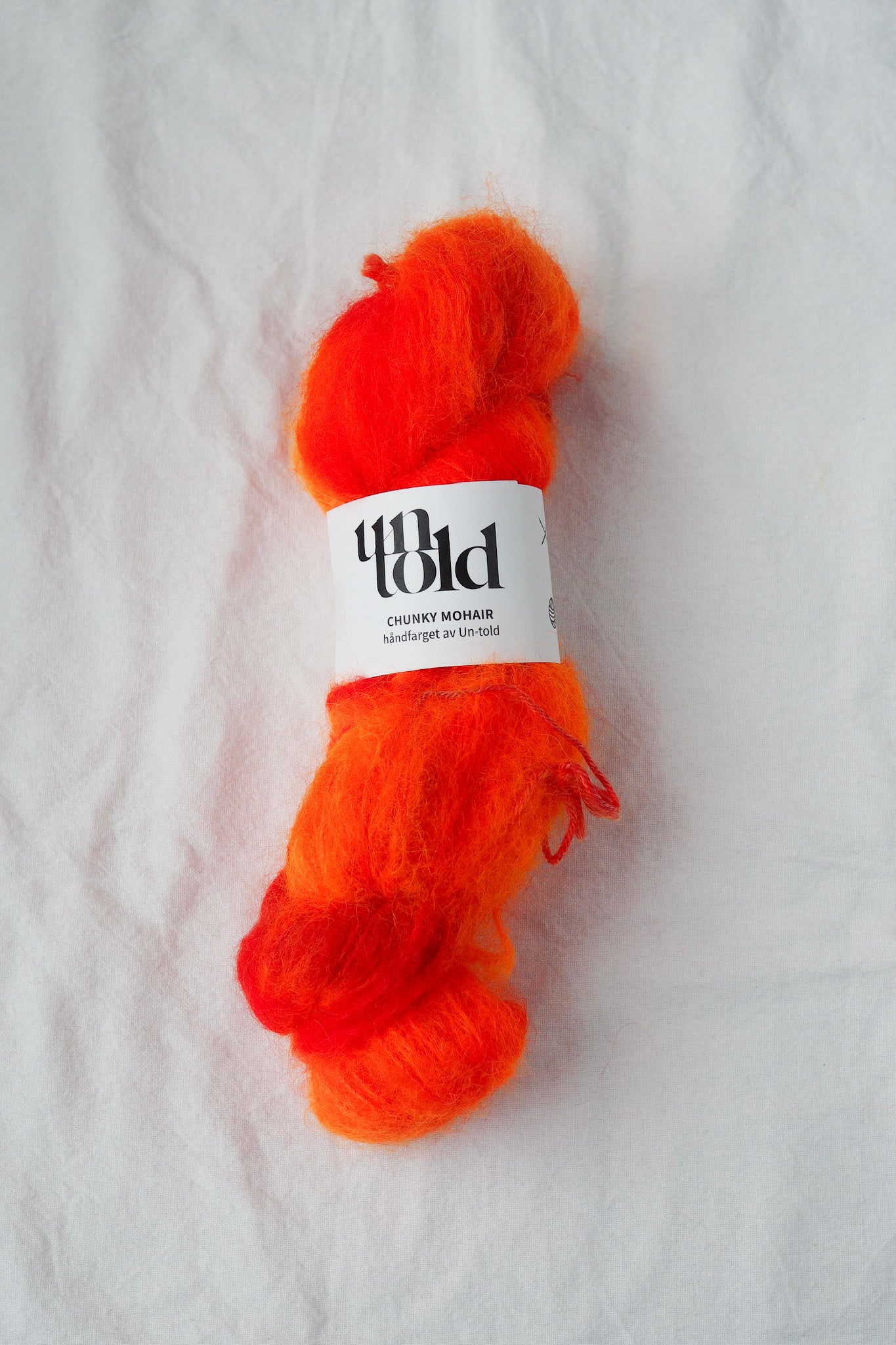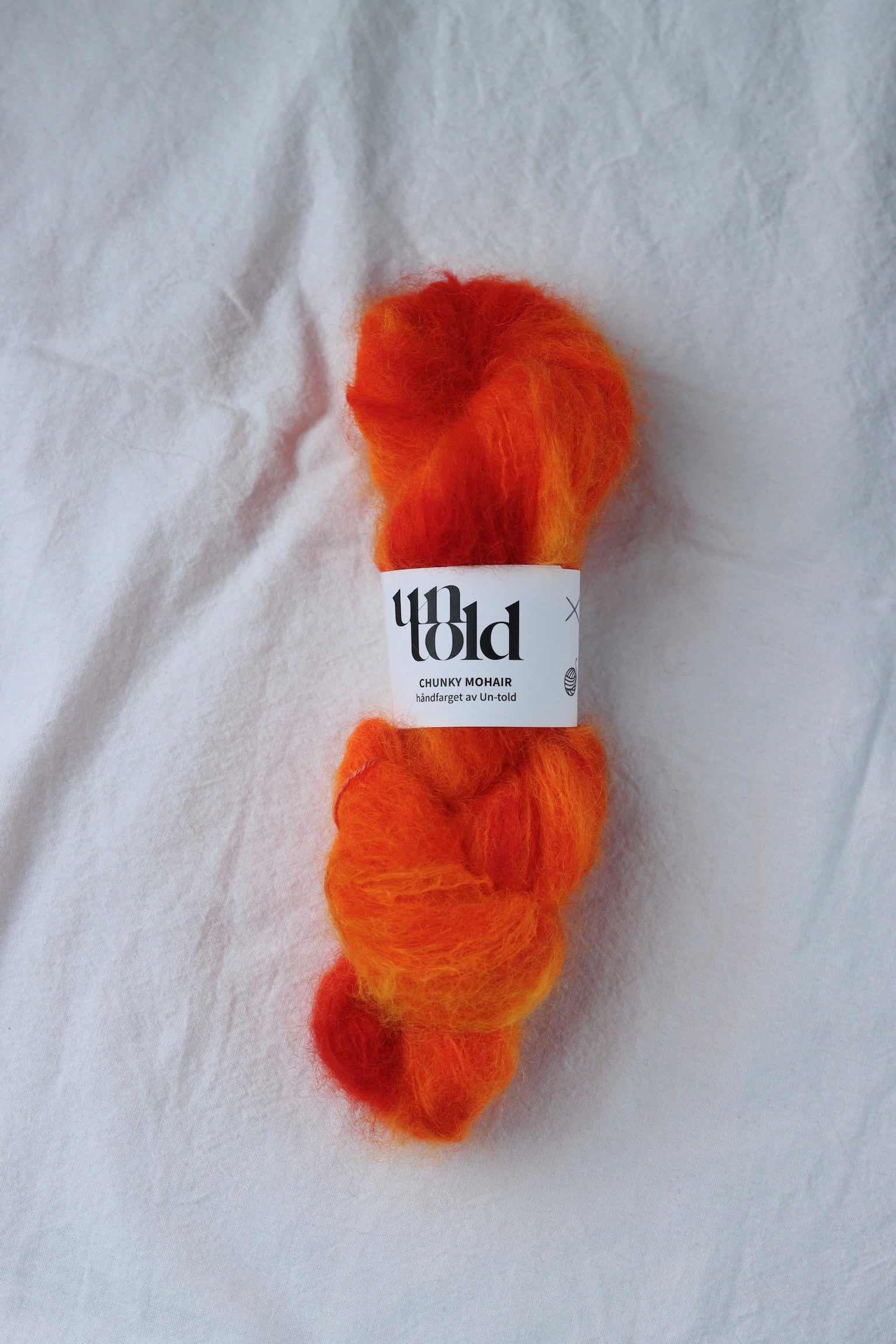 Un-told Chunky mohair er myk og fluffy Non-superwash fat mohair! Garnet er håndfarget av Un-told. Chunky mohair kommer opprinnelig fra Sør-Afrika på gårder hvor mulesing ikke foregår.