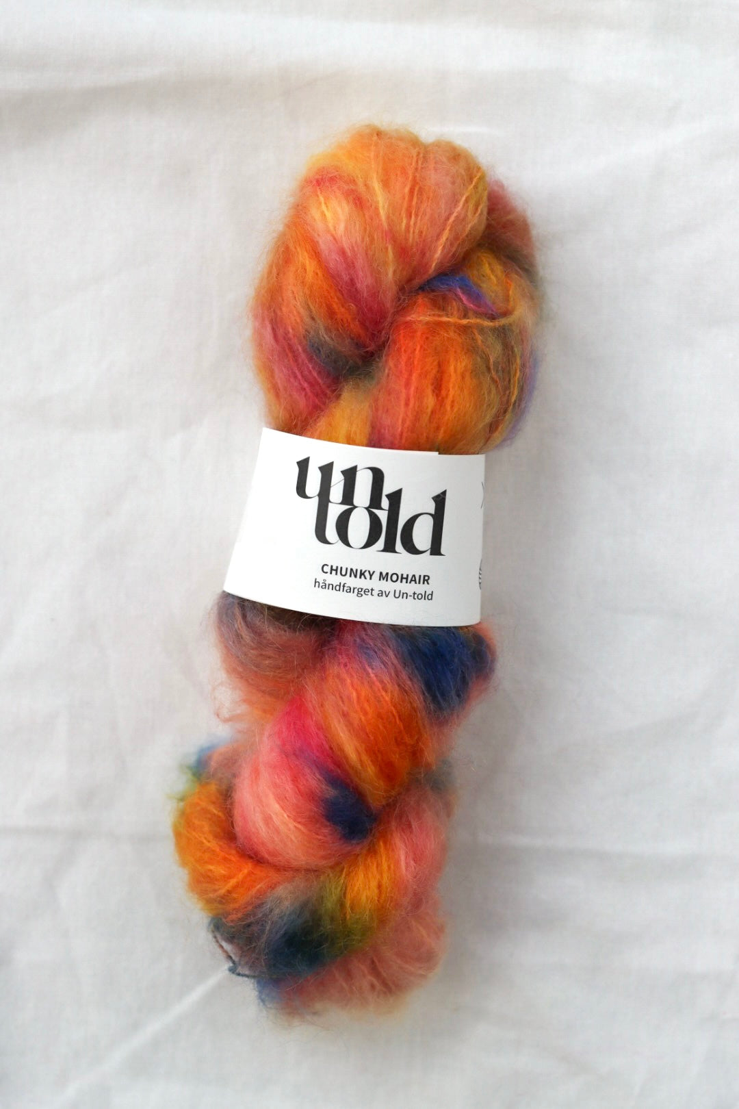 Un-told Chunky mohair er myk og fluffy Non-superwash fat mohair! Garnet er håndfarget av Un-told. Chunky mohair kommer opprinnelig fra Sør-Afrika på gårder hvor mulesing ikke foregår.