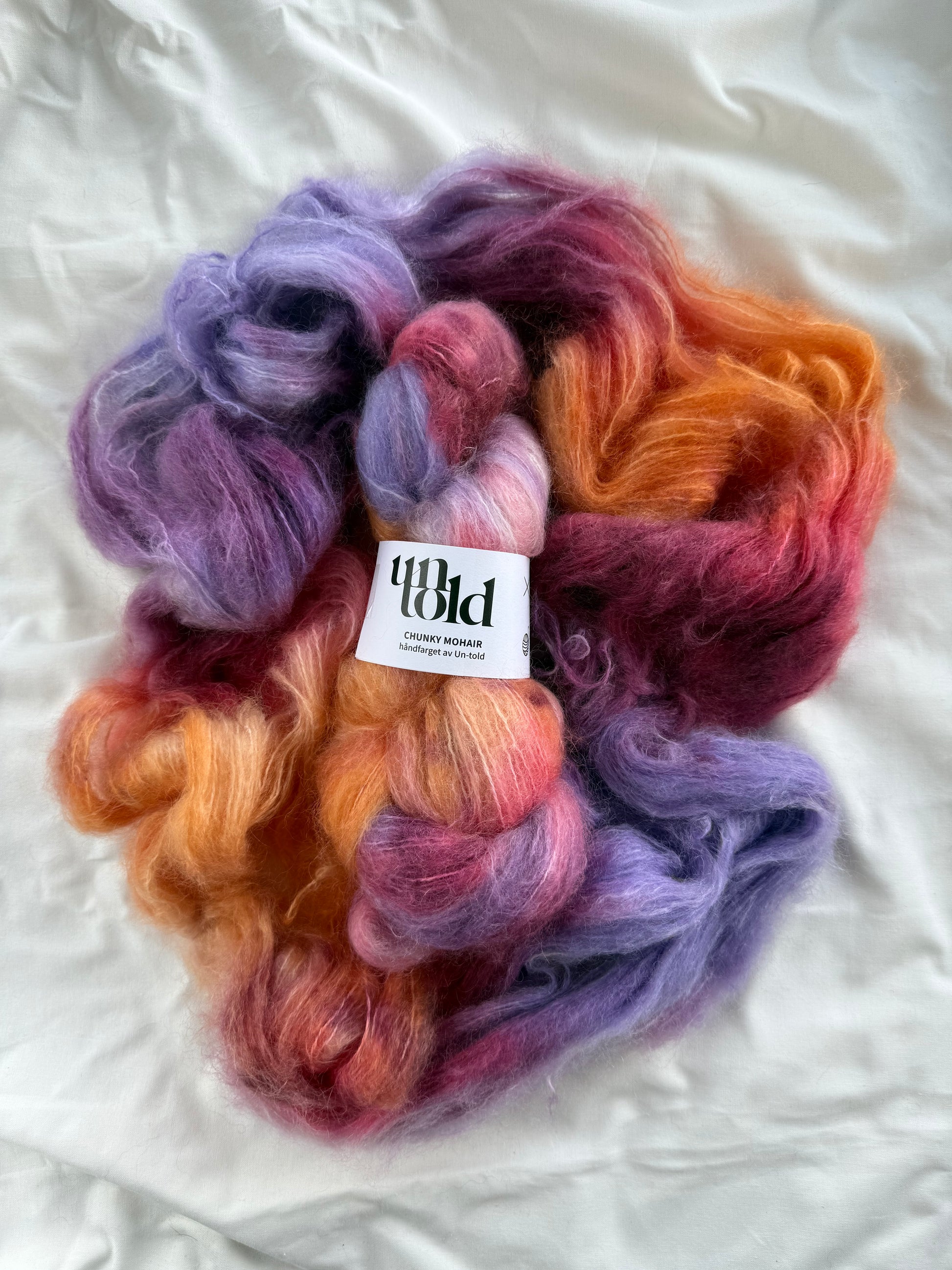 Un-told Chunky mohair er myk og fluffy Non-superwash fat mohair! Garnet er håndfarget av Un-told. Chunky mohair kommer opprinnelig fra Sør-Afrika på gårder hvor mulesing ikke foregår.