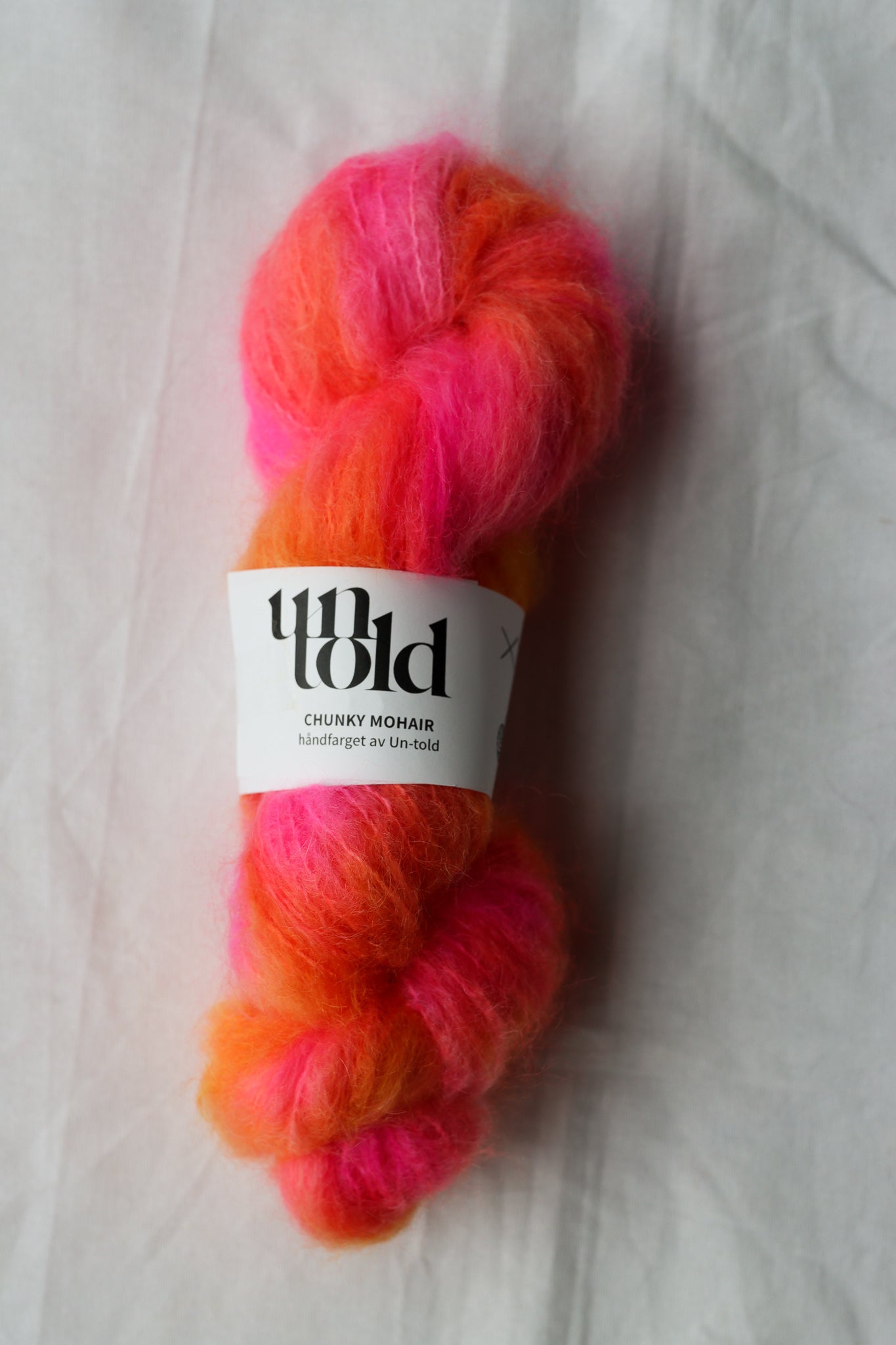 Un-told Chunky mohair er myk og fluffy Non-superwash fat mohair! Garnet er håndfarget av Un-told. Chunky mohair kommer opprinnelig fra Sør-Afrika på gårder hvor mulesing ikke foregår.