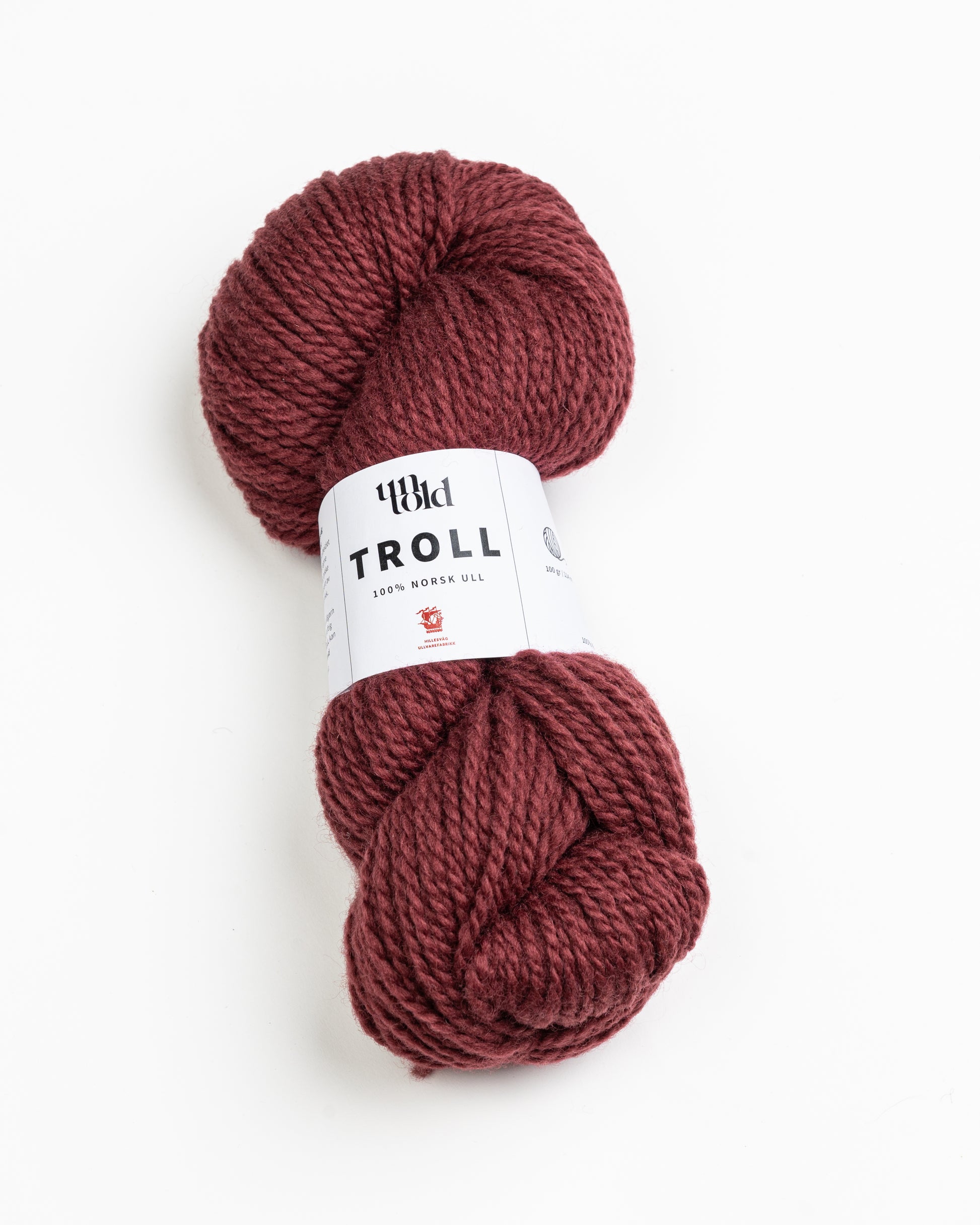 Un-told Troll er 100% ren norsk ull fra Hillesvåg Ullvarefabrikk. I dette eksklusive samarbeidet har Un-told valgt ut egne farger i det deilige og tykke granat TROLL produsert av Hillesvåg Ullvarefabrikk.