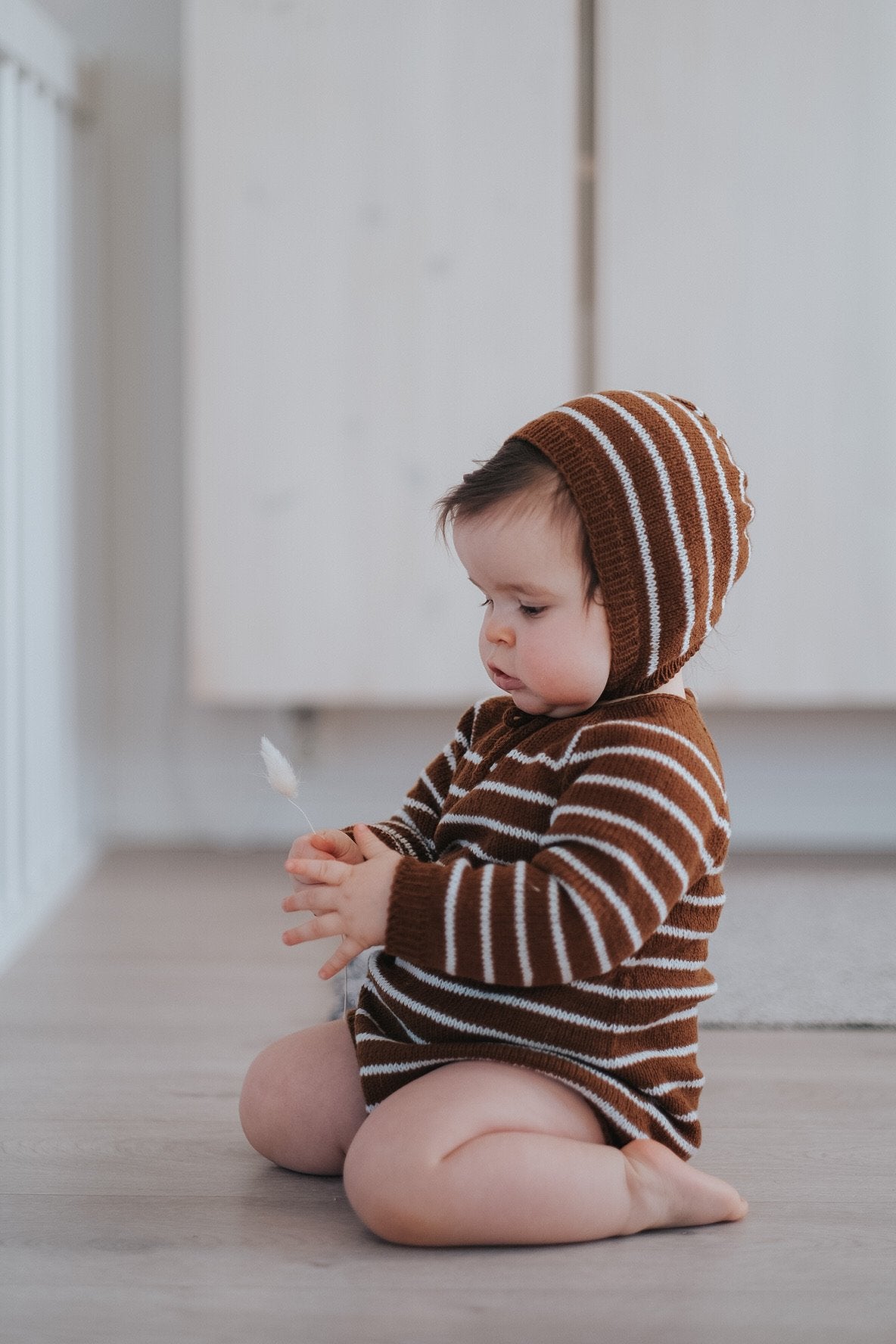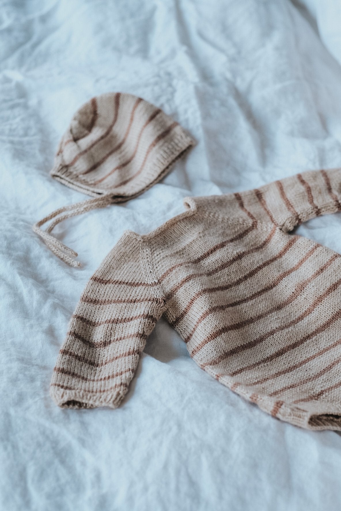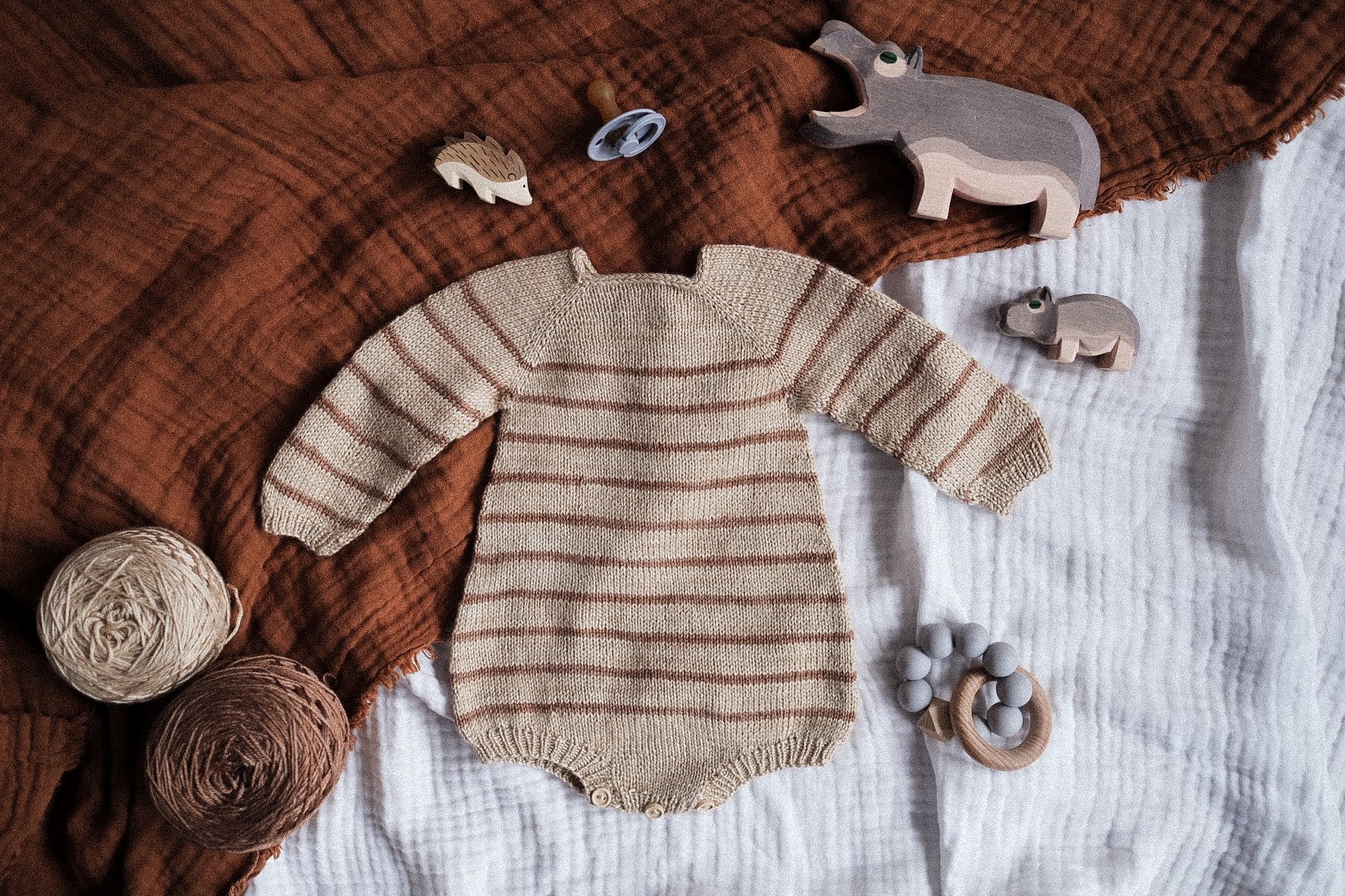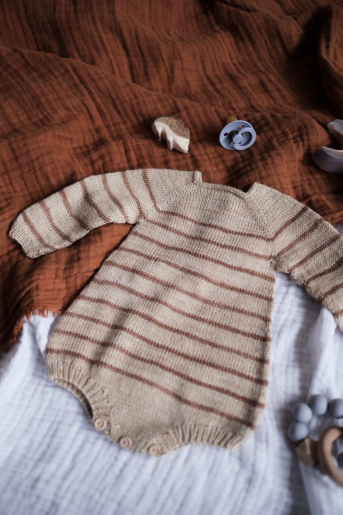 Der Willy Body ist ein simpler, gestreifter Body, der von oben nach unten gestrickt wird. Zuerst werden Maschen mit einem proviso- rischen Anschlag am Halsausschnitt anges- chlagen. Sobald der Body fertig gestrickt ist, were am provisorischen Anschlag Maschen for einen I-Cord Abschluss aufgenommen.